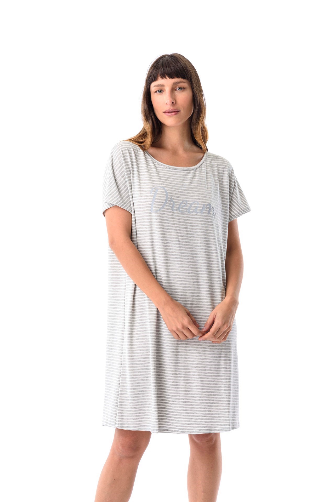 Camisón manga corta con estampa. Dale un toque romántico a tus pijamas, con una estampa de "Dream". De suave modal, este camisón es sin dudas uno de los más cómodos de la colección. Se volverá tu aliado para descansar linda y relajada en casa. De la colección #SoftCollection elaborada con fibras naturales y suaves materiales para brindarte confort y belleza en tu día a día.
